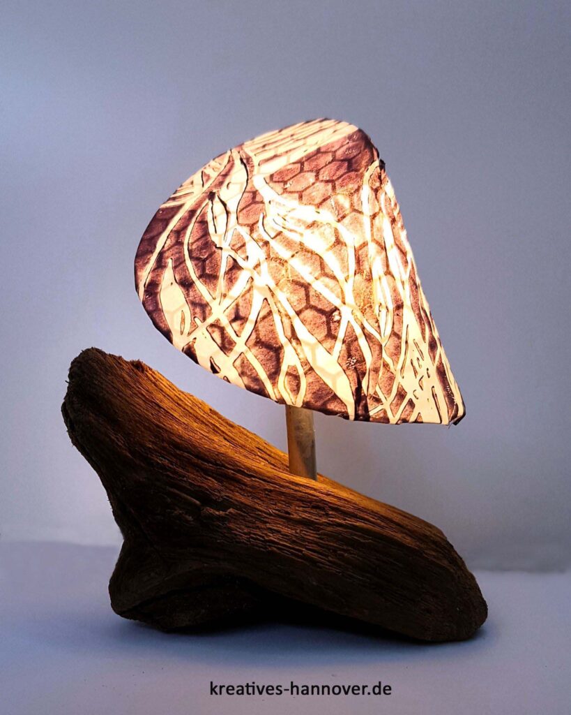 In unserer Werkstatt ist eine Lampe entstanden, die verschiedene Materialien harmonisch miteinander verbindet. Die Basis bildet ein sorgfältig ausgewähltes Stück Treibholz. Wir haben es vorbereitet, bearbeitet und technisch so ausgestattet, dass es nicht nur optisch, sondern auch funktional überzeugt. Der Lampenschirm wurde zunächst aus einem Drahtgitter modelliert. Diese flexible Grundstruktur ermöglichte es, eine individuelle Form