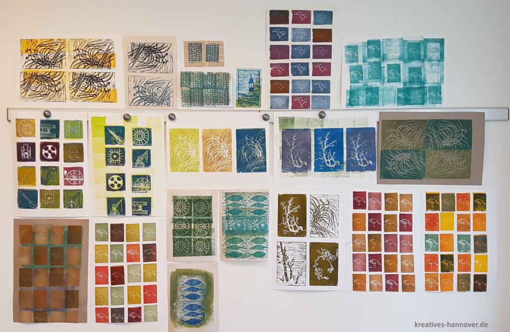 Der Gelplattendruck ist eine experimentelle Monotypie-Drucktechnik, bei der mit einer weichen Gelatineplatte gearbeitet wird. Das Motiv wird direkt von der Platte auf Papier übertragen – meist entsteht dabei ein einzigartiger Abdruck. Durch das Arbeiten in mehreren Farbschichten, das Abziehen von Negativ- und Positivdrucken sowie durch Überdrucke lassen sich vielschichtige, lebendige Ergebnisse erzielen. Diese Drucktechnik lebt