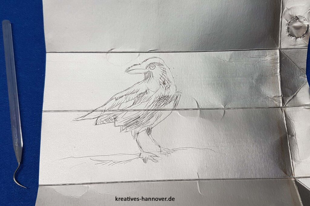 In unserer Werkstatt haben wir eine einfache Tiefdrucktechnik ausprobiert: das Drucken mit Milchtütenkarton. Dazu wird ein silberbeschichteter Tetra Pak aufgeschnitten und flach ausgelegt. Mit einer Nadel ritzt man anschließend das gewünschte Motiv in die Beschichtung.