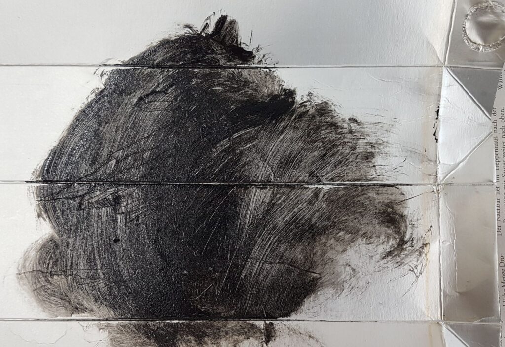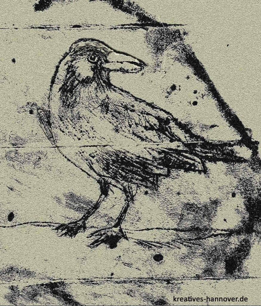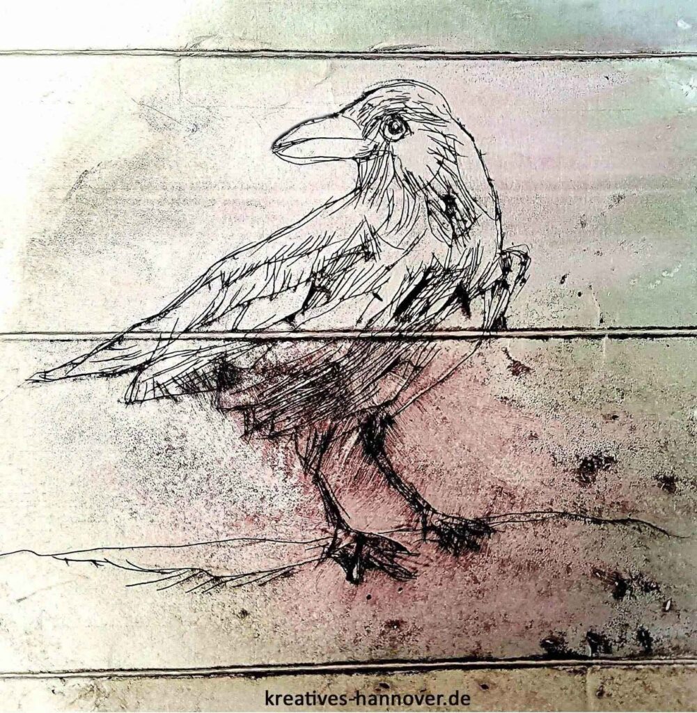 Danach wird die Oberfläche mit Druckfarbe eingerieben und die überschüssige Farbe wieder abgerieben, sodass sie nur in den eingeritzten Linien zurückbleibt. Für den Druck legt man ein leicht angefeuchtetes Papier auf die Vorlage.
