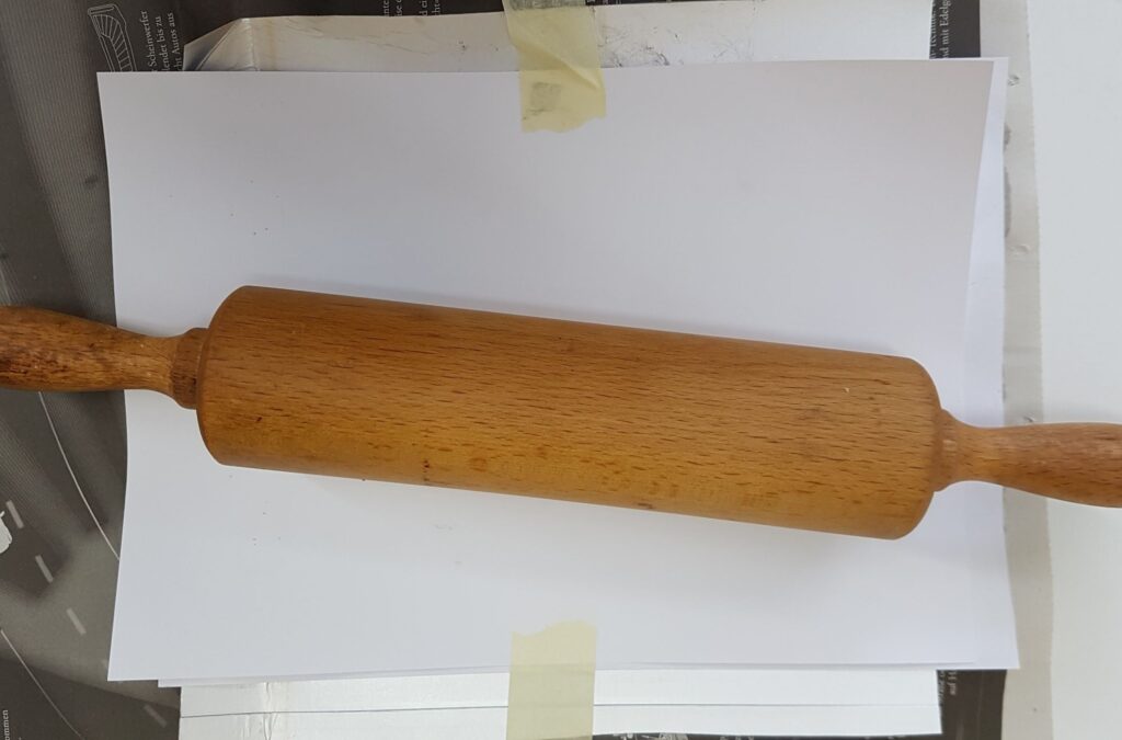Da wir weder eine Druckpresse noch eine Pastamaschine zur Verfügung hatten, haben wir einfach ein Nudelholz verwendet. Mit kräftigem Druck wird das Papier über die Platte gerollt, sodass die Farbe aus den Rillen auf das Papier übertragen wird.