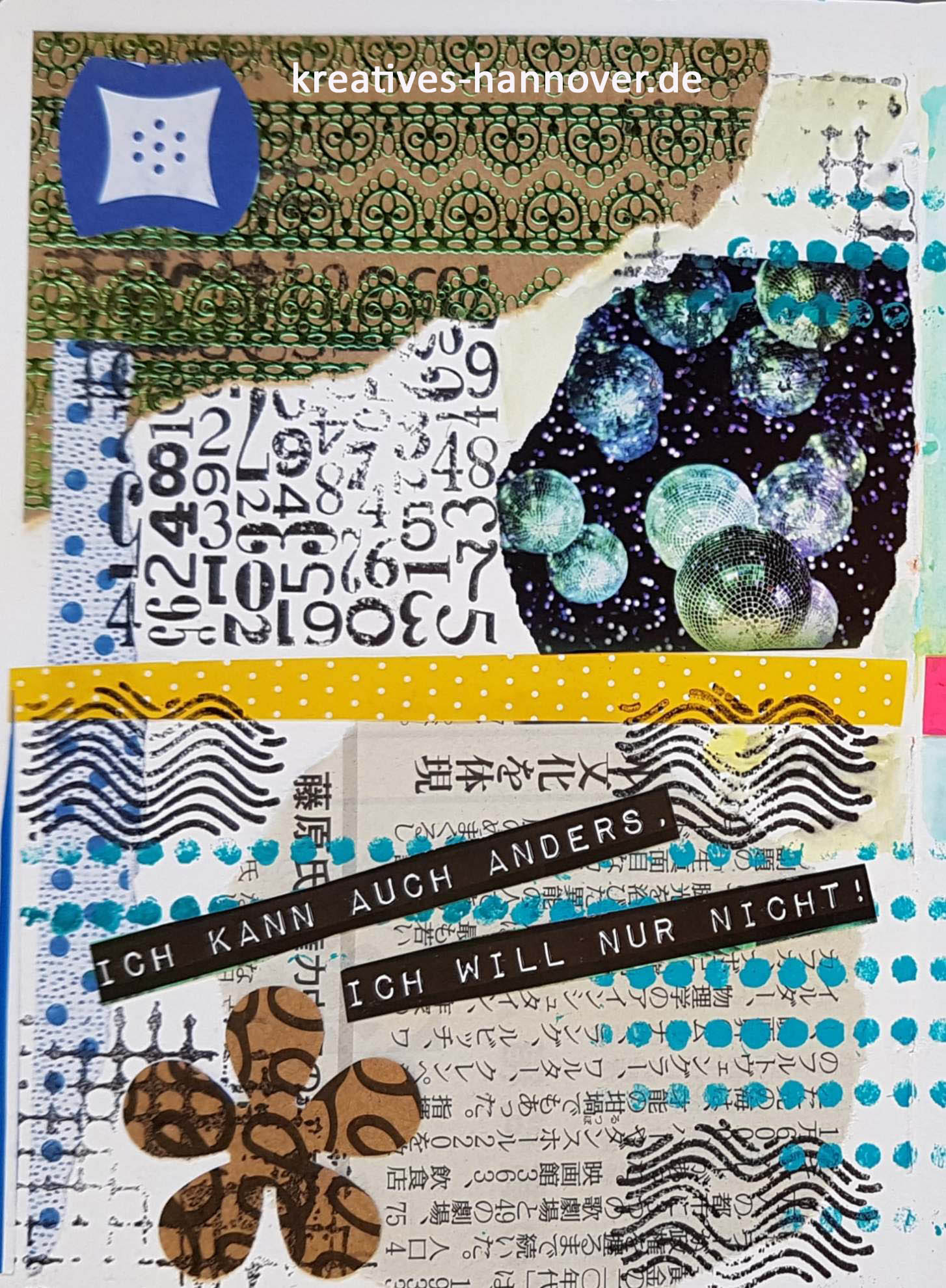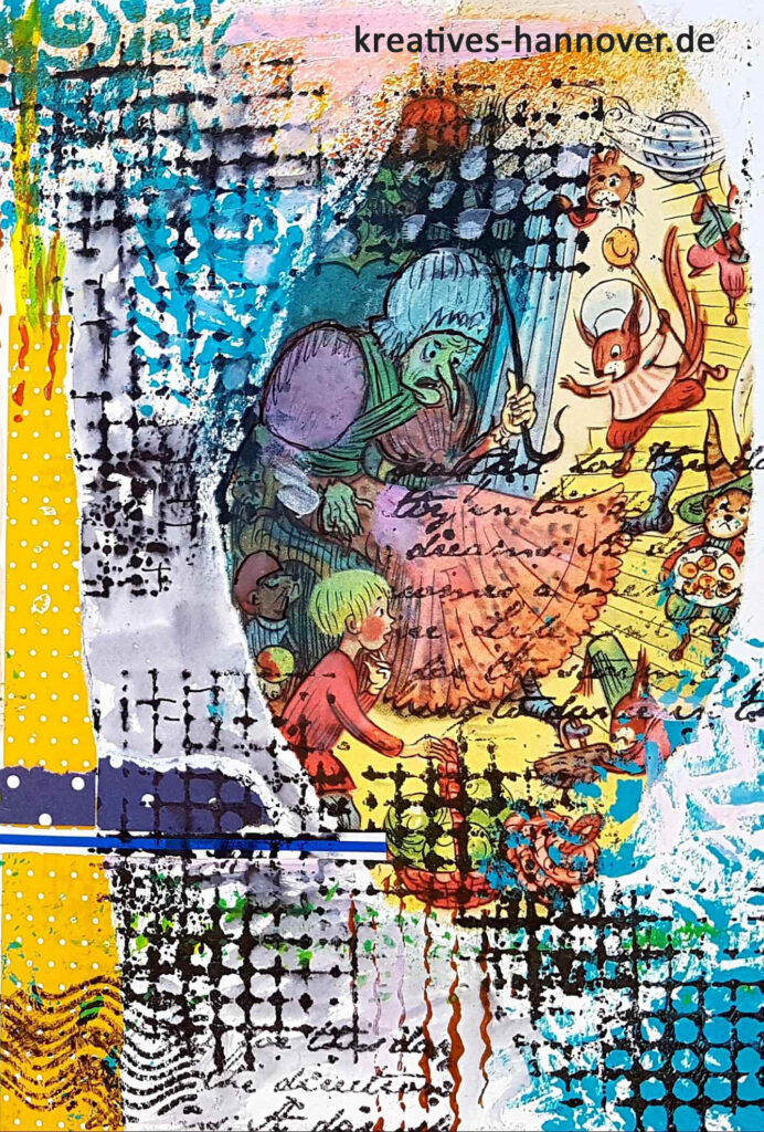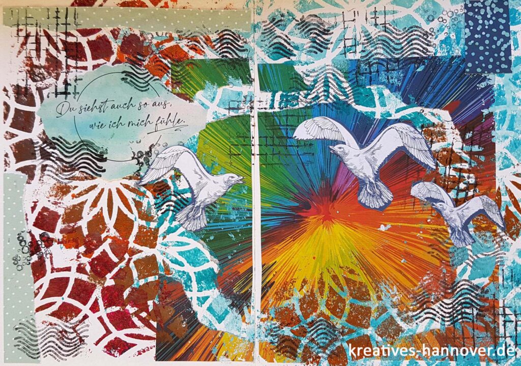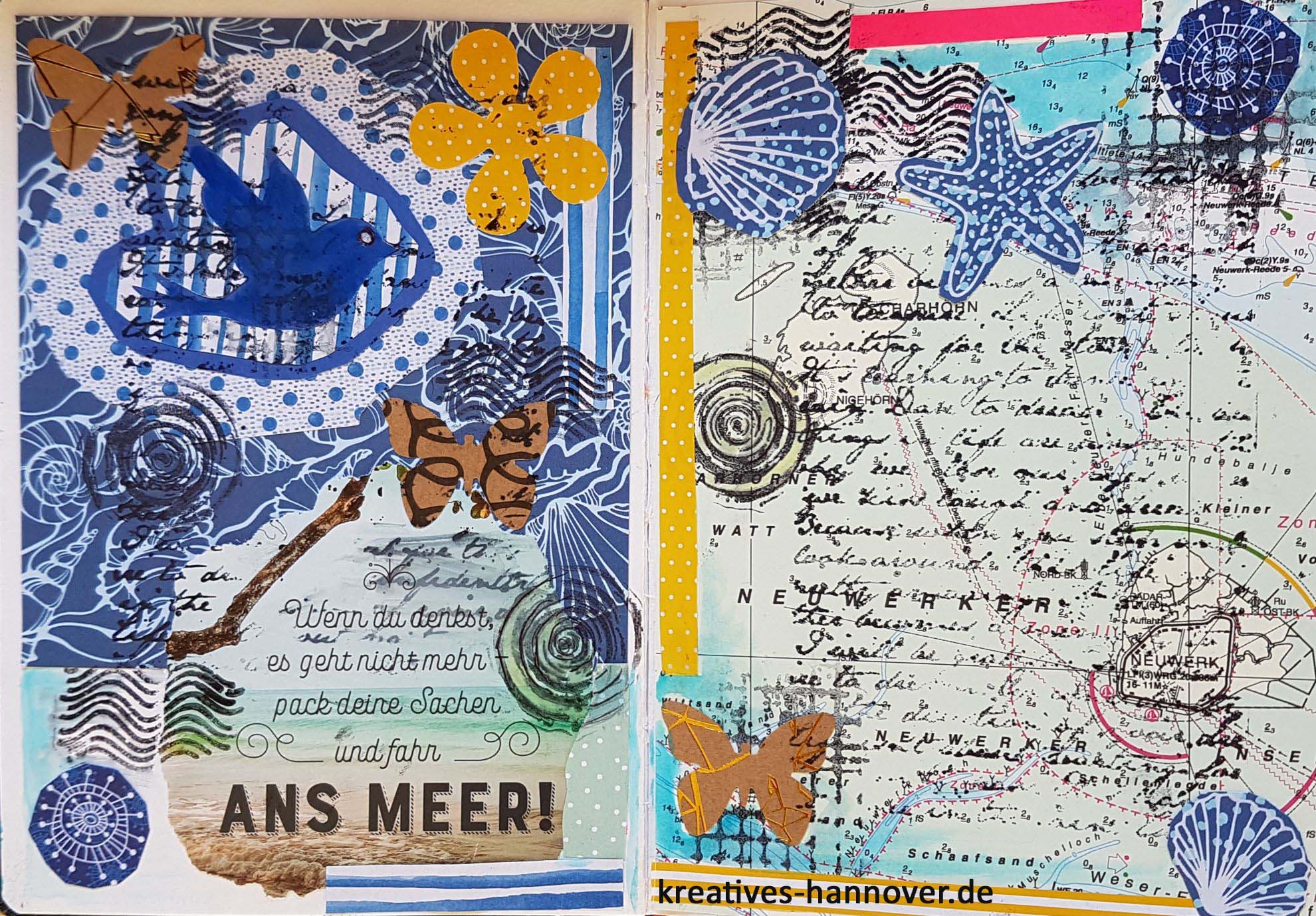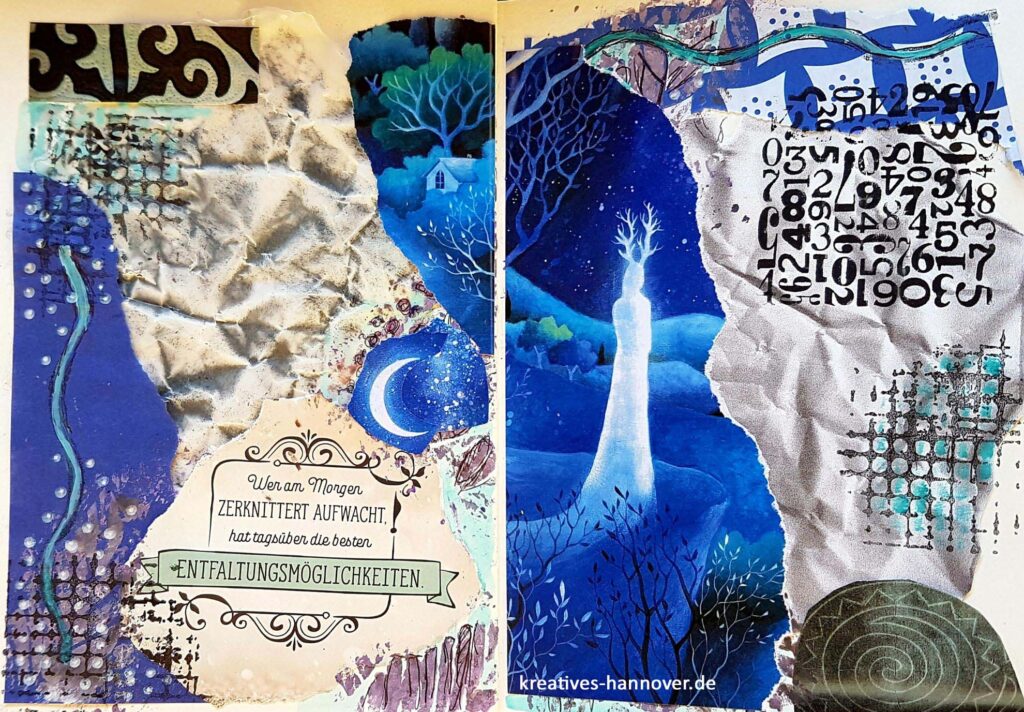 Neugierig geworden, habe ich mich zu einem Wochenendkurs angemeldet, um diese Kunstform näher kennenzulernen. Was uns dort erwartete, war eine inspirierende Fülle an Materialien: Farben, Papiere, Stempel, Zeitschriftenausschnitte, Schablonen, Stifte in allen Variationen und vieles mehr.